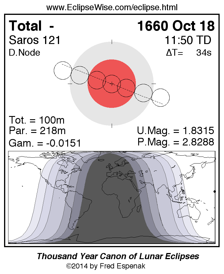 The total lunar eclipse of 1660 Oct 18 is preceded two weeks earlier by a partial solar eclipse on 1660 Oct 04,