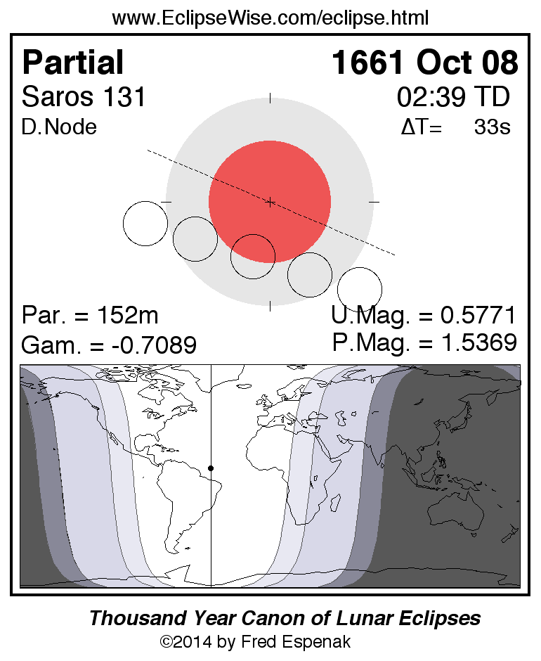 The instant of greatest eclipse takes place on 1661 Oct 08 at 02:39:02 TD (02:38:29 UT1).