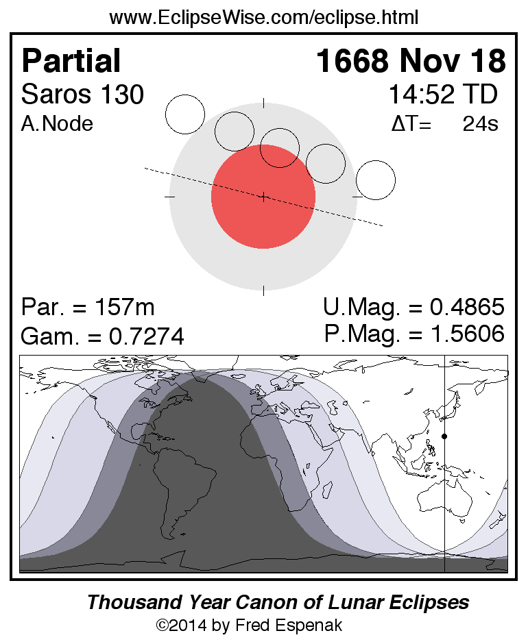 The instant of greatest eclipse takes place on 1668 Nov 18 at 14:52:17 TD (14:51:53 UT1).