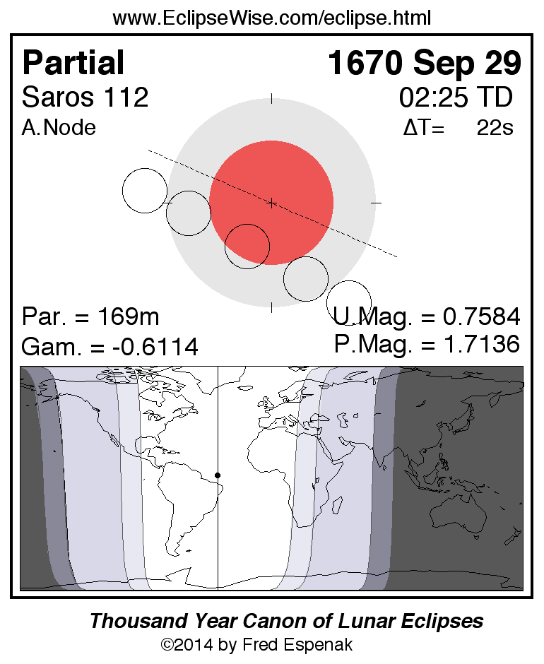 The instant of greatest eclipse takes place on 1670 Sep 29 at 02:24:54 TD (02:24:32 UT1).