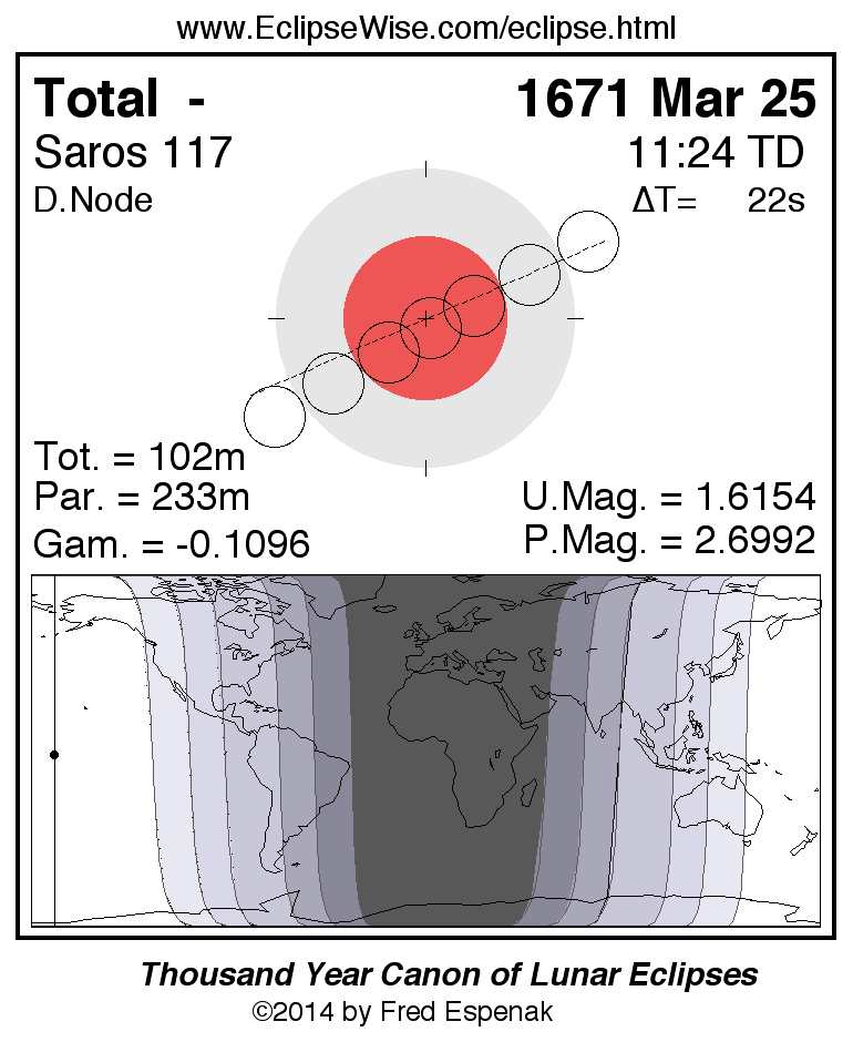 The total lunar eclipse of 1671 Mar 25 is preceded two weeks earlier by a partial solar eclipse on 1671 Mar 11,