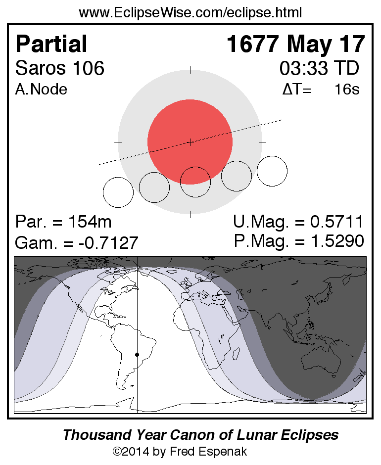 The instant of greatest eclipse takes place on 1677 May 17 at 03:32:57 TD (03:32:41 UT1).