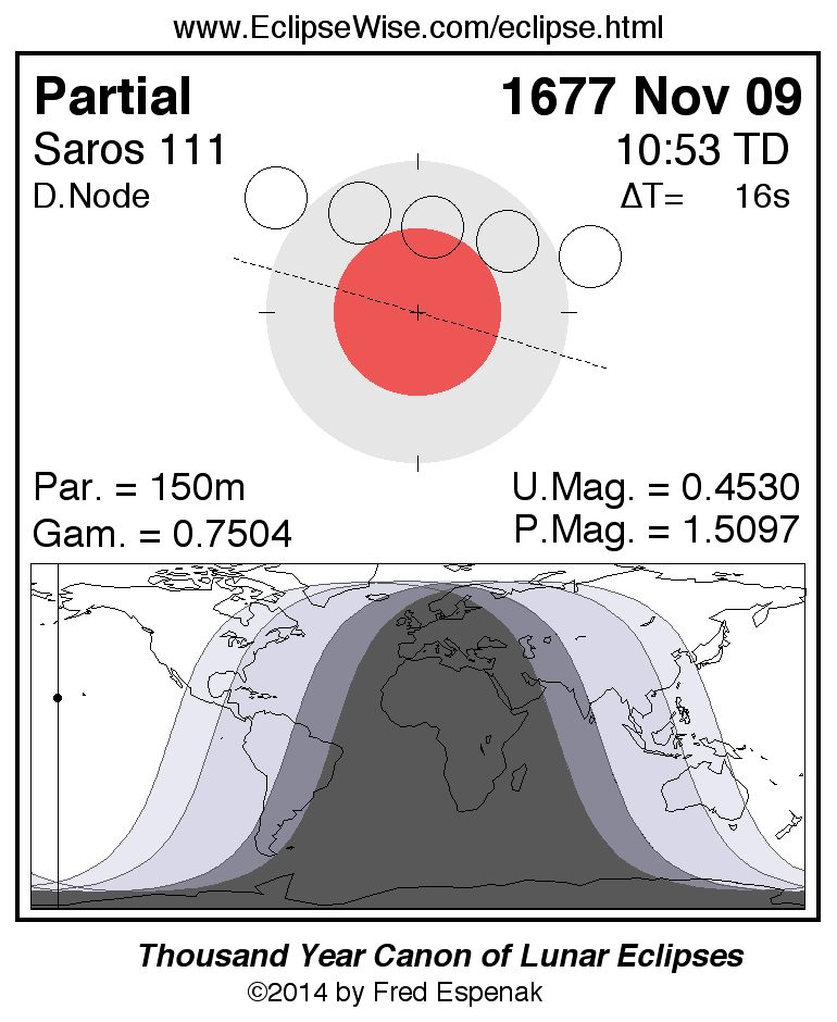 The instant of greatest eclipse takes place on 1677 Nov 09 at 10:52:39 TD (10:52:24 UT1).