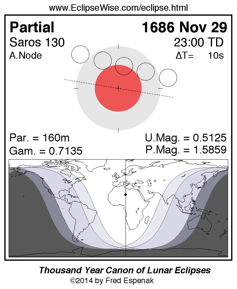 The instant of greatest eclipse takes place on 1686 Nov 29 at 22:59:47 TD (22:59:37 UT1).