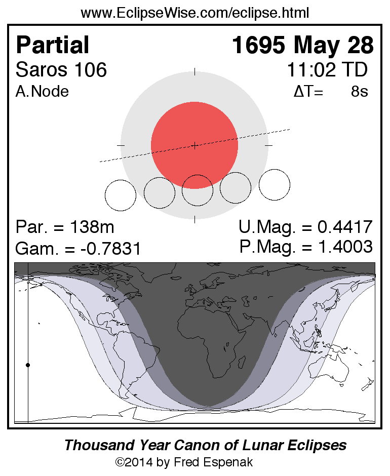 The instant of greatest eclipse takes place on 1695 May 28 at 11:01:57 TD (11:01:49 UT1).