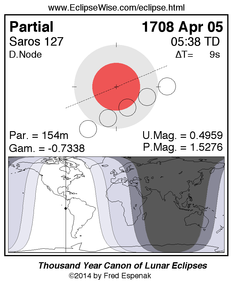 The partial lunar eclipse of 1708 Apr 05 is preceded two weeks earlier by a annular solar eclipse on 1708 Mar 22.