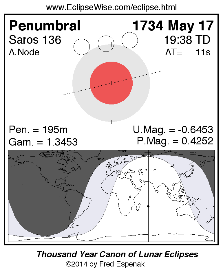 The penumbral lunar eclipse of 1734 May 17 is preceded two weeks earlier by a total solar eclipse on 1734 May 03.