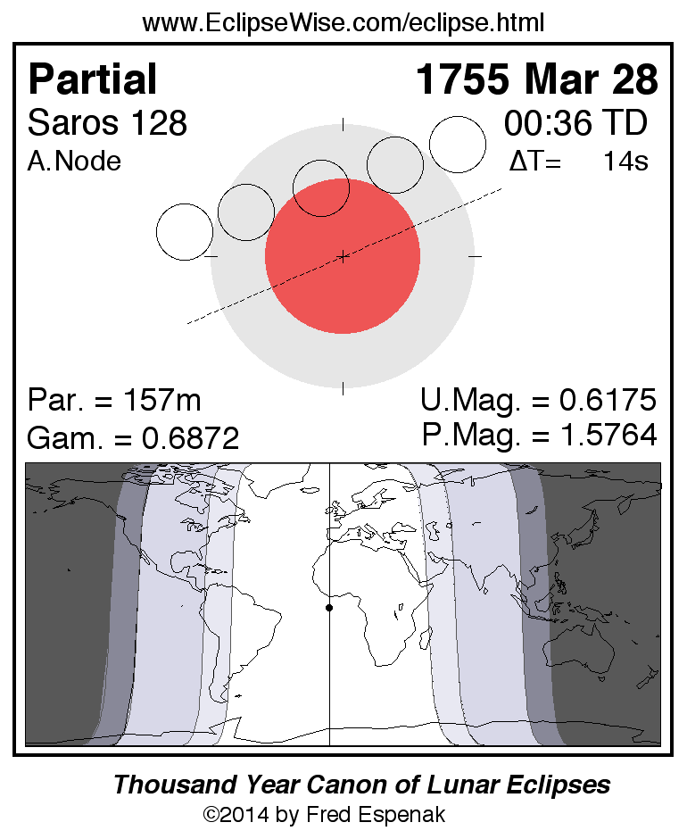 The instant of greatest eclipse takes place on 1755 Mar 28 at 00:36:25 TD (00:36:11 UT1).