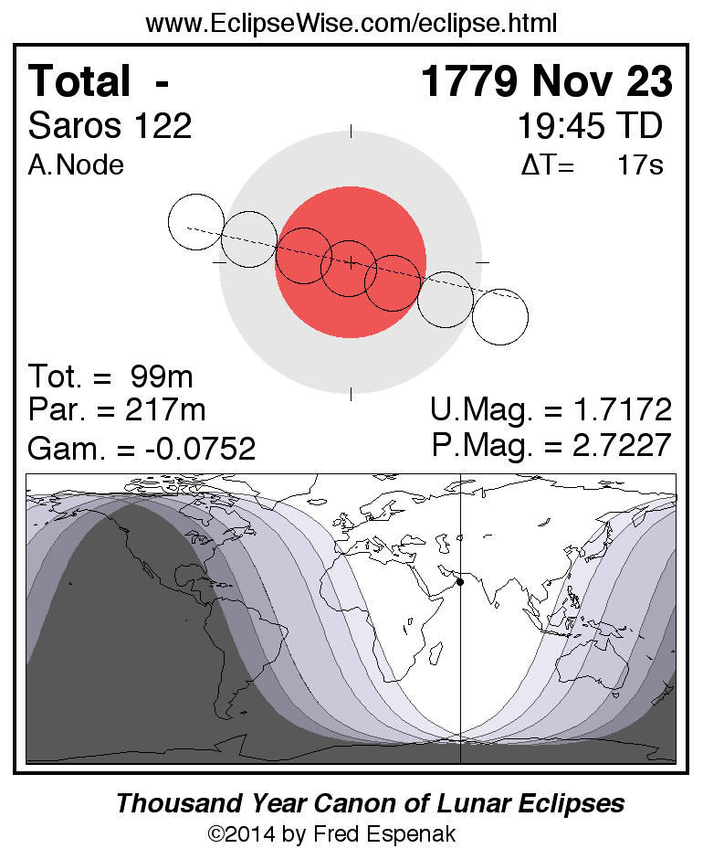 The instant of greatest eclipse takes place on 1779 Nov 23 at 19:44:46 TD (19:44:30 UT1).