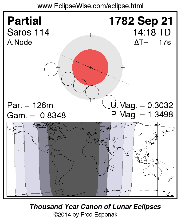 The partial lunar eclipse of 1782 Sep 21 is followed two weeks later by a total solar eclipse on 1782 Oct 07.