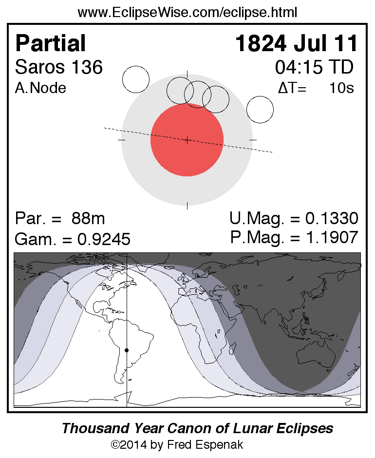 The instant of greatest eclipse takes place on 1824 Jul 11 at 04:14:59 TD (04:14:49 UT1).