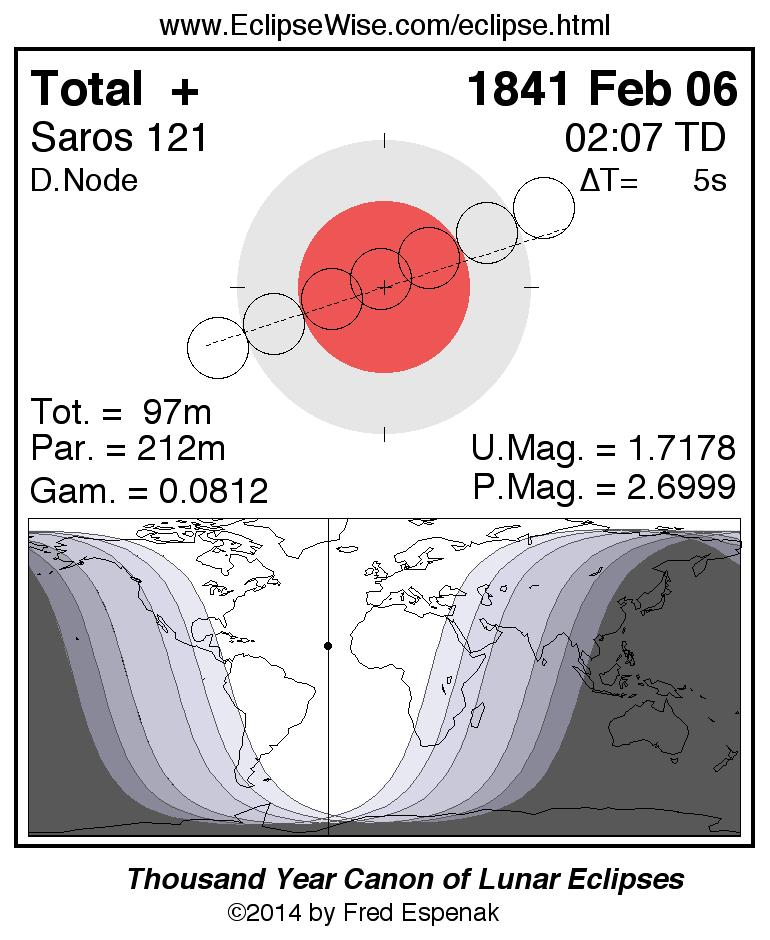 The instant of greatest eclipse takes place on 1841 Feb 06 at 02:07:13 TD (02:07:07 UT1).