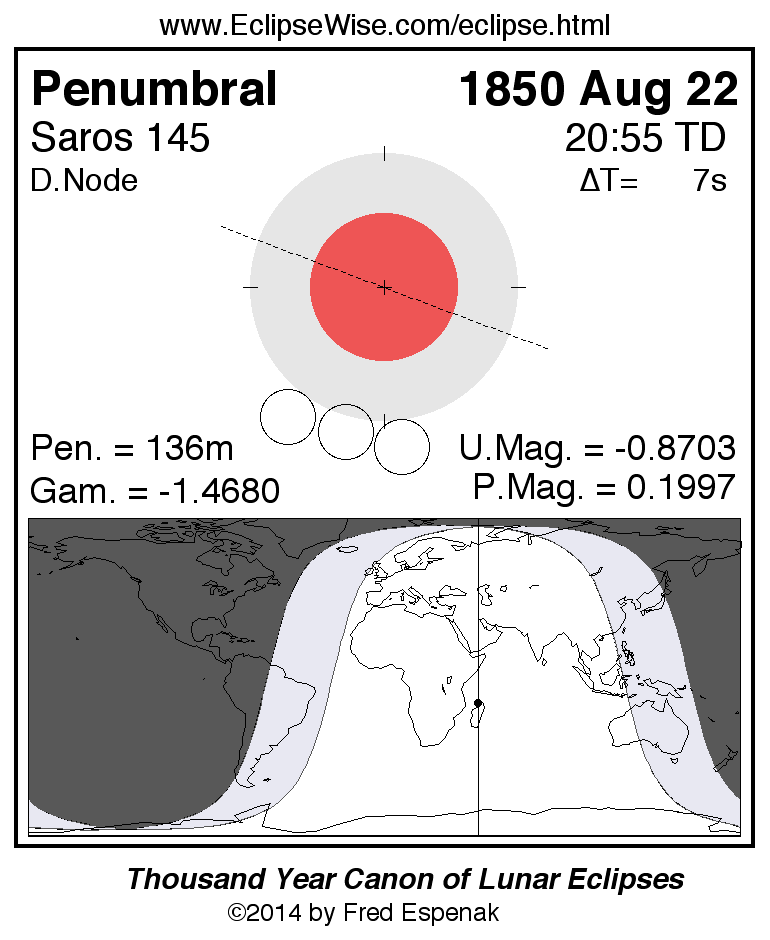 Another lunar eclipse occurs one synodic month before the 1850 Aug 22 eclipse. It is the penumbral lunar eclipse of 1850 Jul 24.