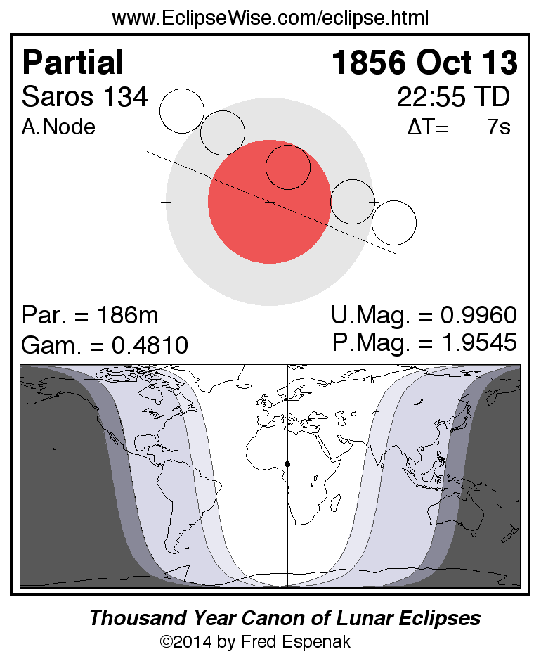 The instant of greatest eclipse takes place on 1856 Oct 13 at 22:54:33 TD (22:54:26 UT1).