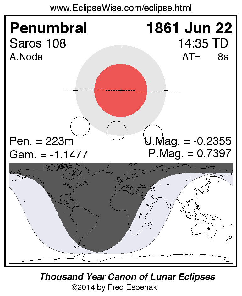 The penumbral lunar eclipse of 1861 Jun 22 is followed two weeks later by a annular solar eclipse on 1861 Jul 08.
