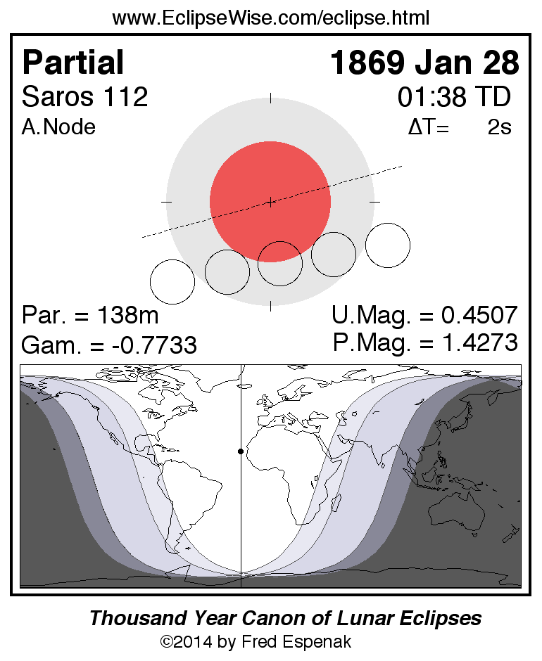 The partial lunar eclipse of 1869 Jan 28 is followed two weeks later by a annular solar eclipse on 1869 Feb 11.