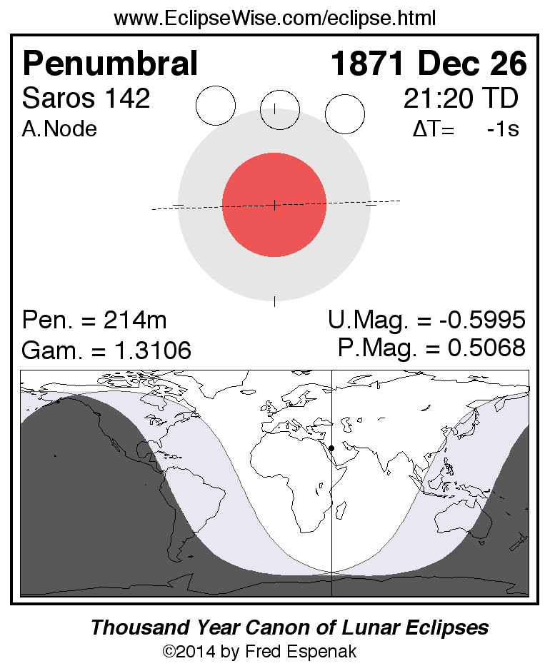 The penumbral lunar eclipse of 1871 Dec 26 is preceded two weeks earlier by a total solar eclipse on 1871 Dec 12.