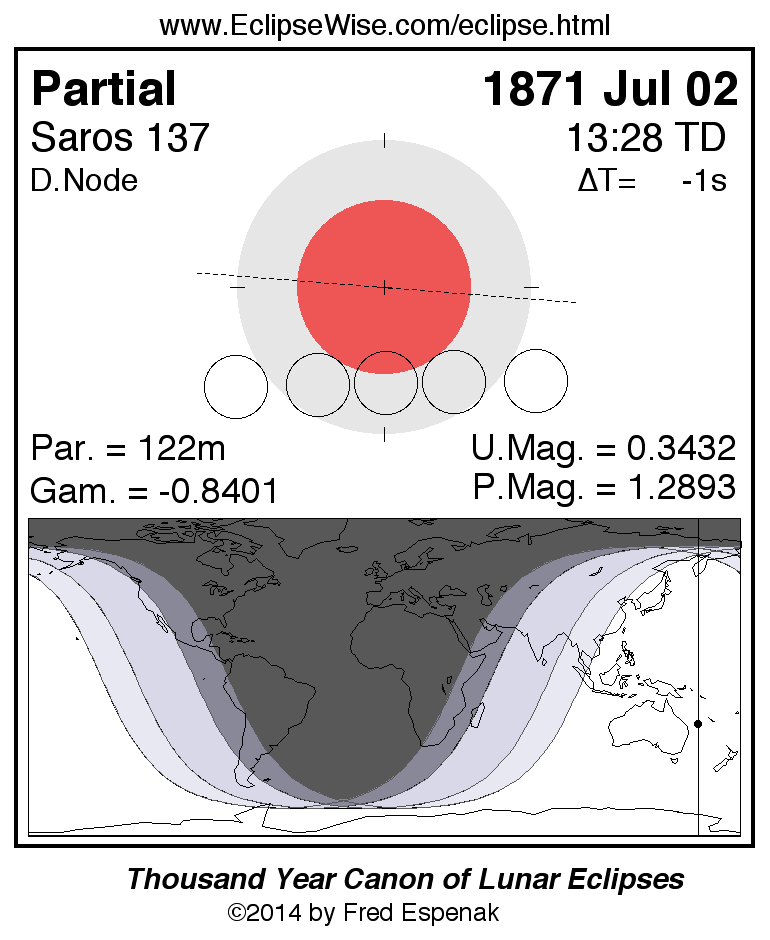 The instant of greatest eclipse takes place on 1871 Jul 02 at 13:27:48 TD (13:27:48 UT1).