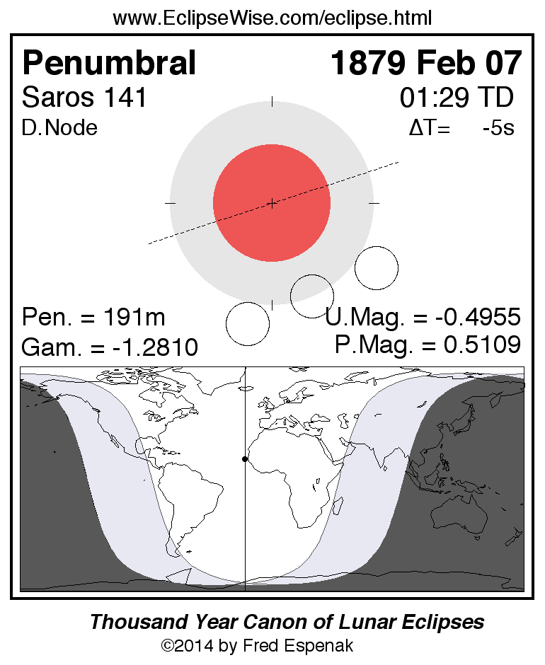 Another lunar eclipse occurs one synodic month before the 1879 Feb 07 eclipse. It is the penumbral lunar eclipse of 1879 Jan 08.