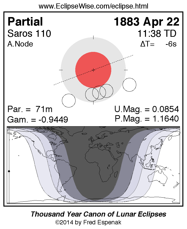 The partial lunar eclipse of 1883 Apr 22 is followed two weeks later by a total solar eclipse on 1883 May 06.