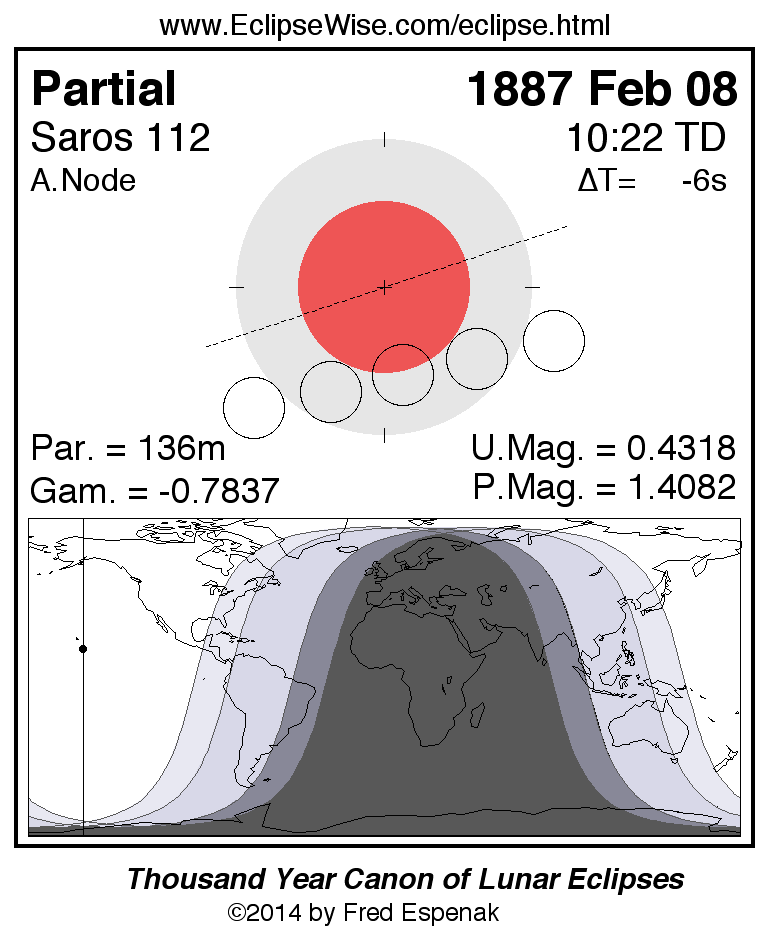 The instant of greatest eclipse takes place on 1887 Feb 08 at 10:22:03 TD (10:22:09 UT1).