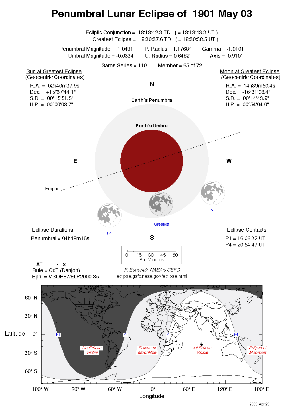 The penumbral lunar eclipse of 1901 May 03 is followed two weeks later by a total solar eclipse on 1901 May 18.