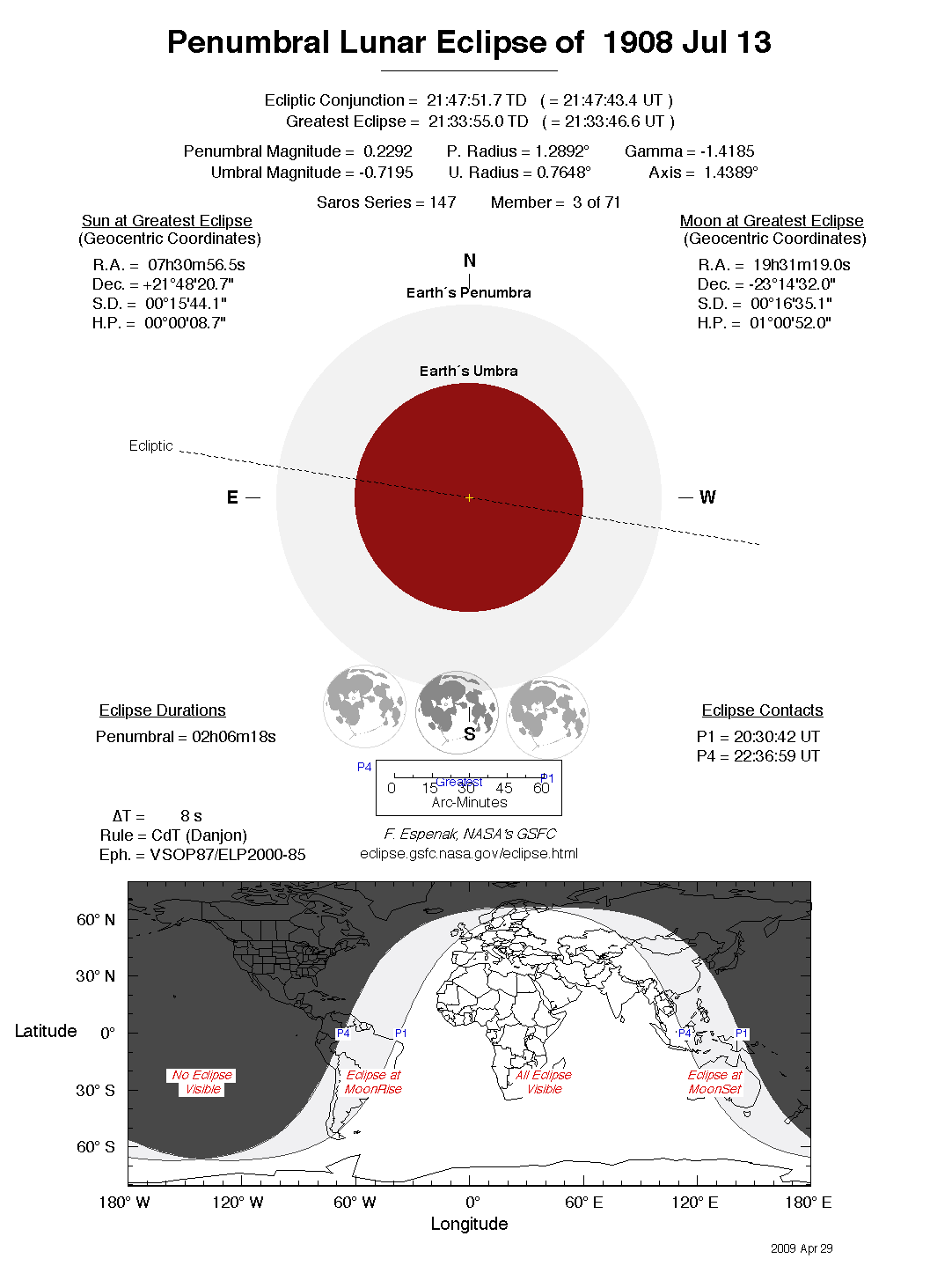Another lunar eclipse occurs one synodic month before the 1908 Jul 13 eclipse. It is the penumbral lunar eclipse of 1908 Jun 14.