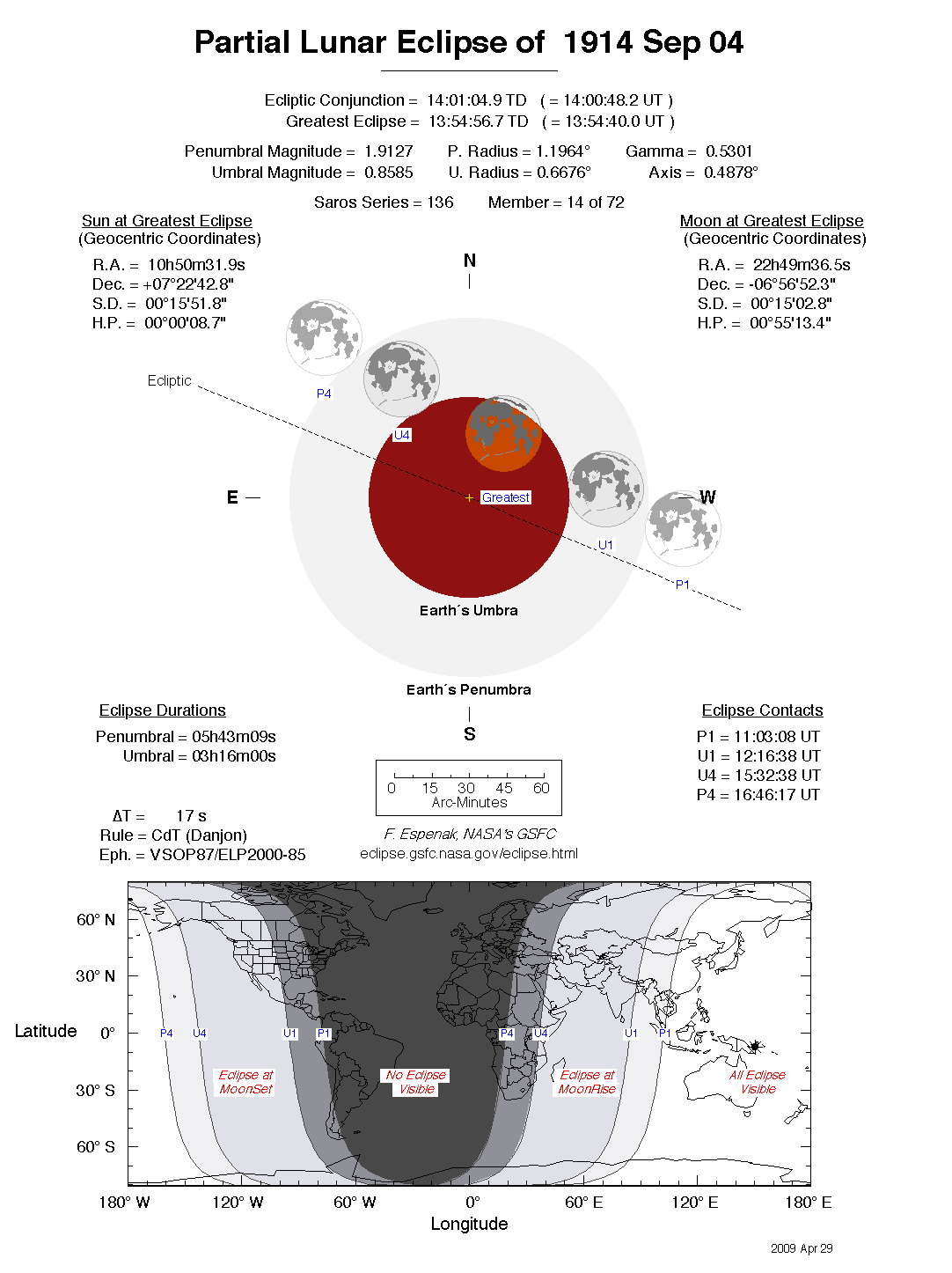The tables below contain detailed predictions and additional information on the Partial Lunar Eclipse of 1914 Sep 04 .