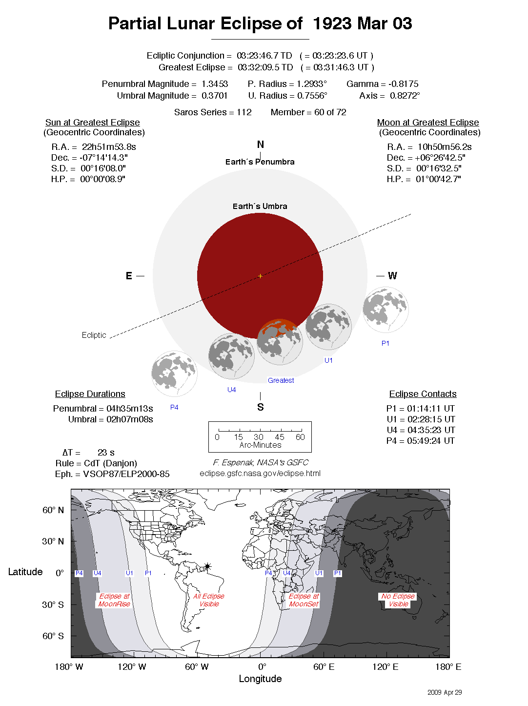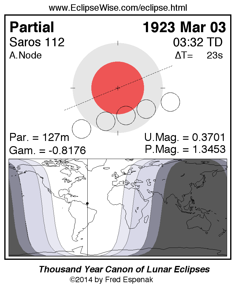 The tables below contain detailed predictions and additional information on the Partial Lunar Eclipse of 1923 Mar 03 .