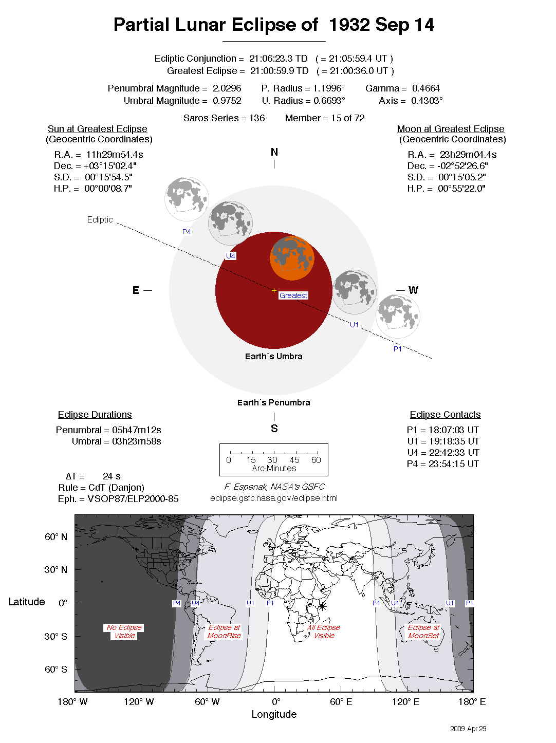 The tables below contain detailed predictions and additional information on the Partial Lunar Eclipse of 1932 Sep 14 .