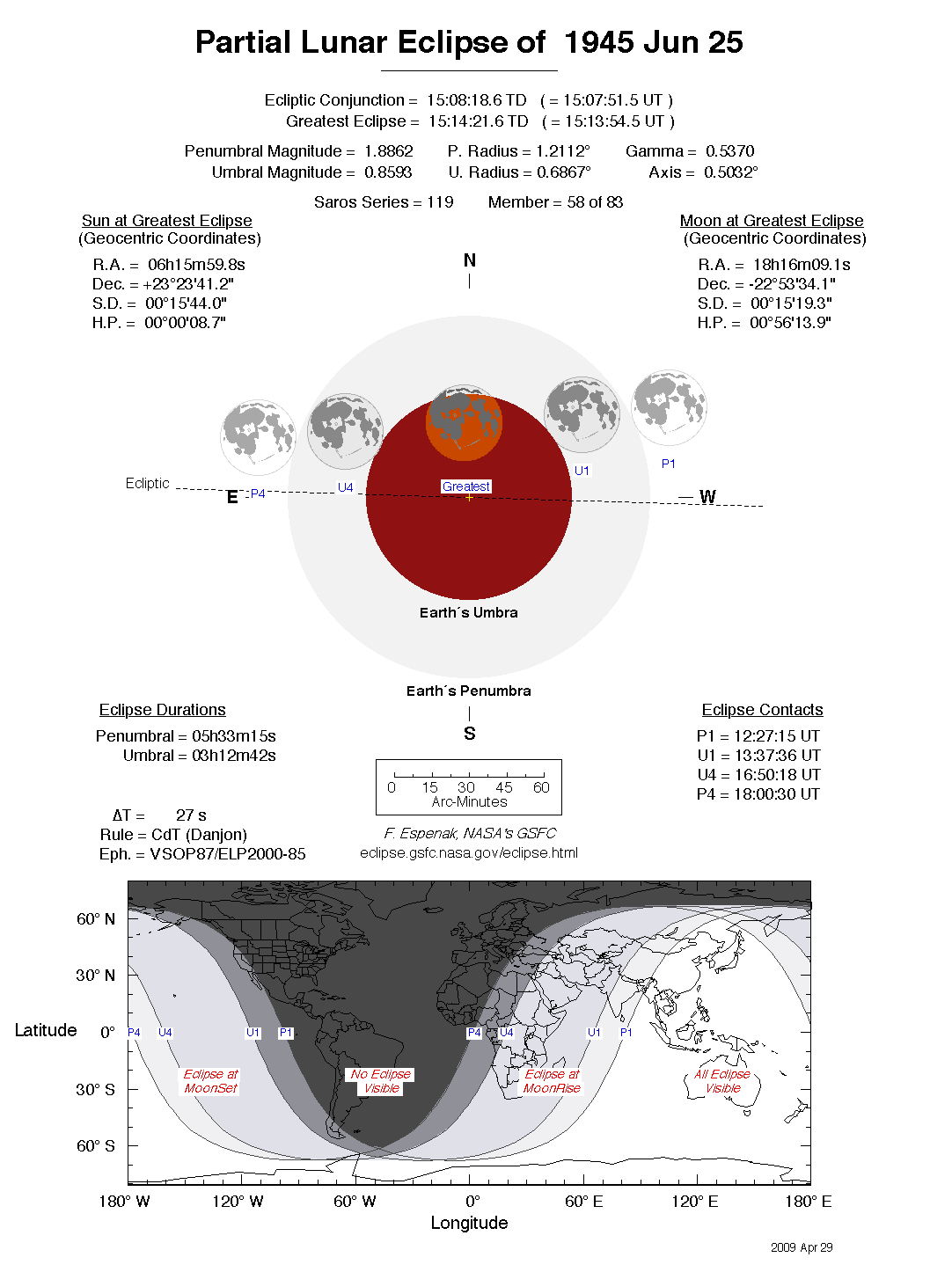 The tables below contain detailed predictions and additional information on the Partial Lunar Eclipse of 1945 Jun 25 .