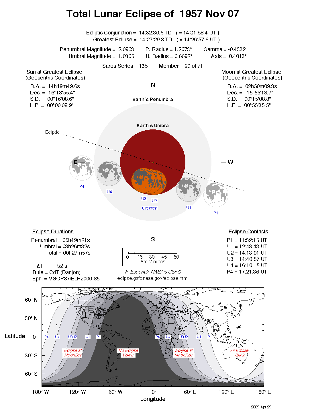 The instant of greatest eclipse takes place on 1957 Nov 07 at 14:27:30 TD (14:26:58 UT1). This is 5.1 days after the Moon reaches apogee. During the eclipse, the Moon is in the constellation Aries. The synodic month in which the eclipse takes place has a Brown Lunation Number of 431.
