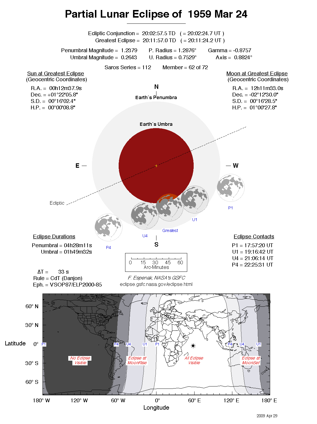 The tables below contain detailed predictions and additional information on the Partial Lunar Eclipse of 1959 Mar 24 .