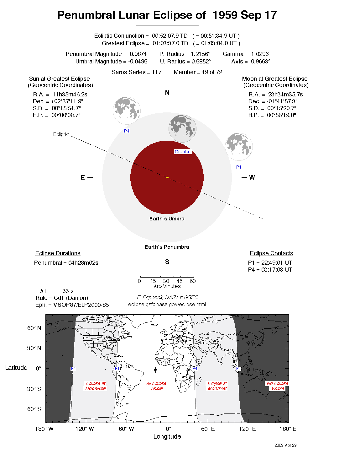 The tables below contain detailed predictions and additional information on the Penumbral Lunar Eclipse of 1959 Sep 17 .