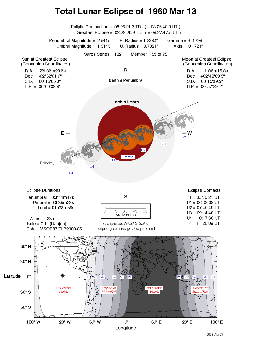 The instant of greatest eclipse takes place on 1960 Mar 13 at 08:28:21 TD (08:27:48 UT1). This is 5.9 days before the Moon reaches perigee. During the eclipse, the Moon is in the constellation Leo. The synodic month in which the eclipse takes place has a Brown Lunation Number of 460.