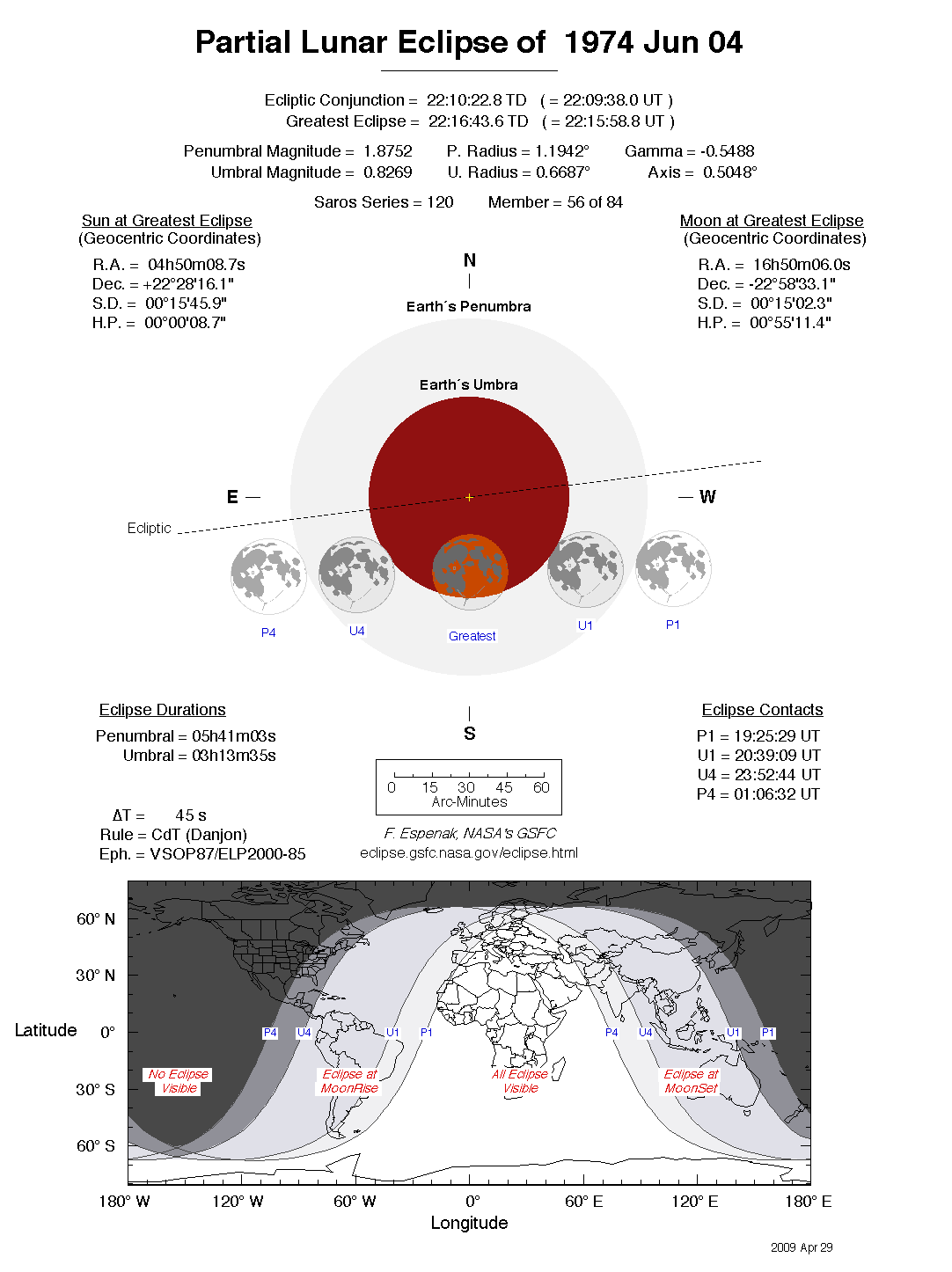 The tables below contain detailed predictions and additional information on the Partial Lunar Eclipse of 1974 Jun 04 .