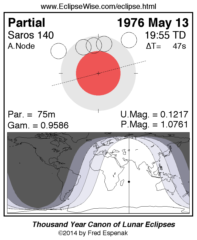 The partial lunar eclipse of 1976 May 13 is preceded two weeks earlier by a annular solar eclipse on 1976 Apr 29.