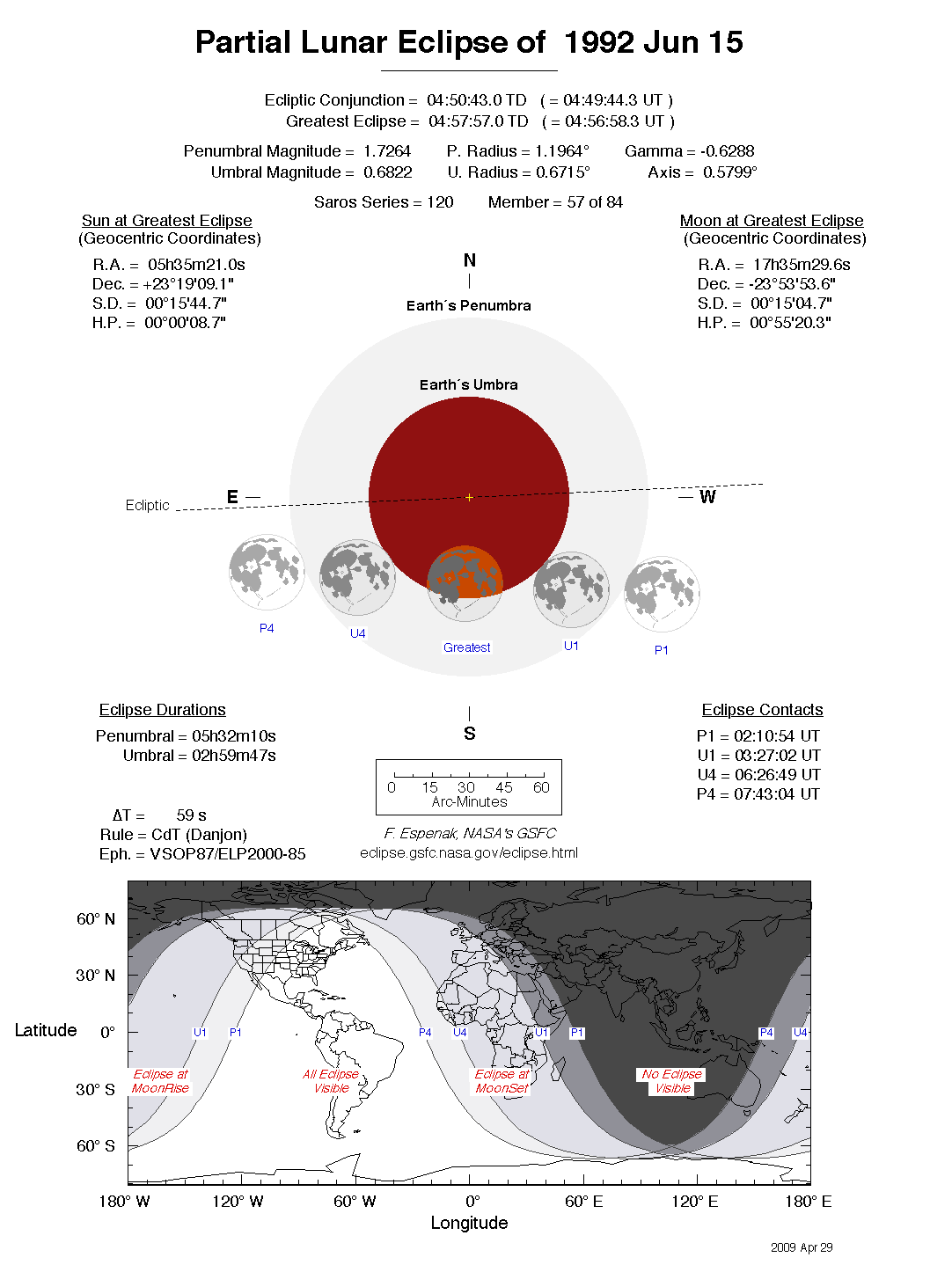 The tables below contain detailed predictions and additional information on the Partial Lunar Eclipse of 1992 Jun 15 .