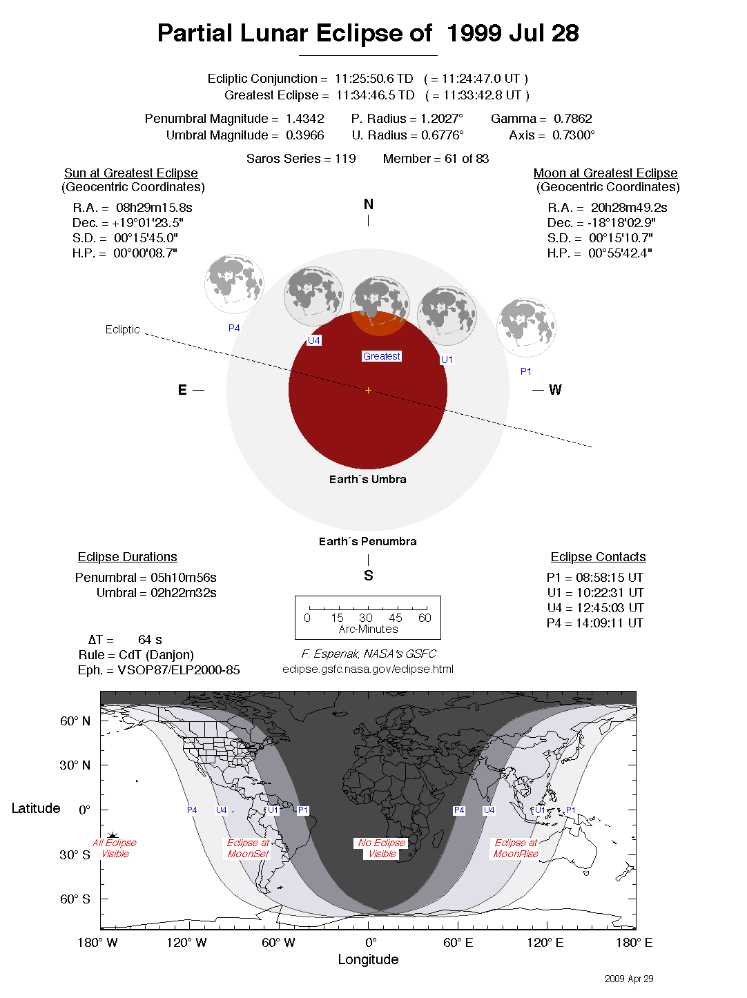 The tables below contain detailed predictions and additional information on the Partial Lunar Eclipse of 1999 Jul 28 .
