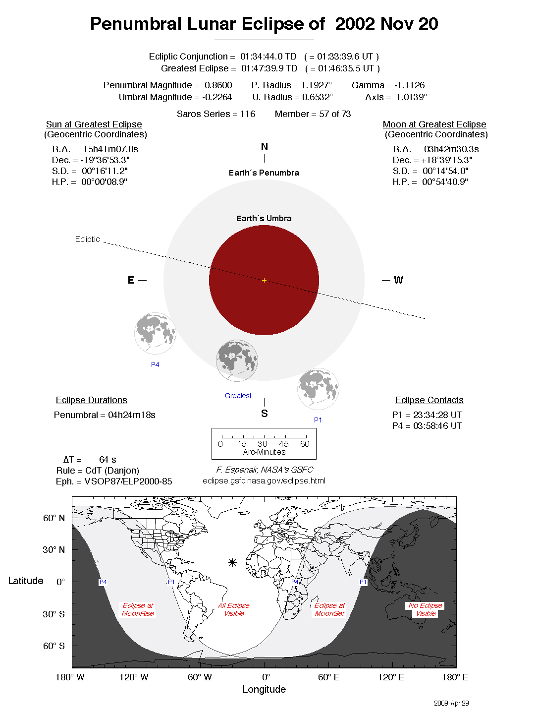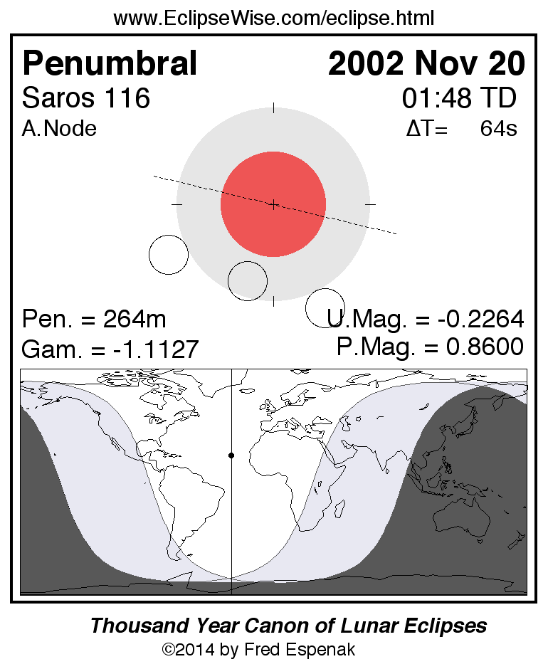 The penumbral lunar eclipse of 2002 Nov 20 is followed two weeks later by a total solar eclipse on 2002 Dec 04.