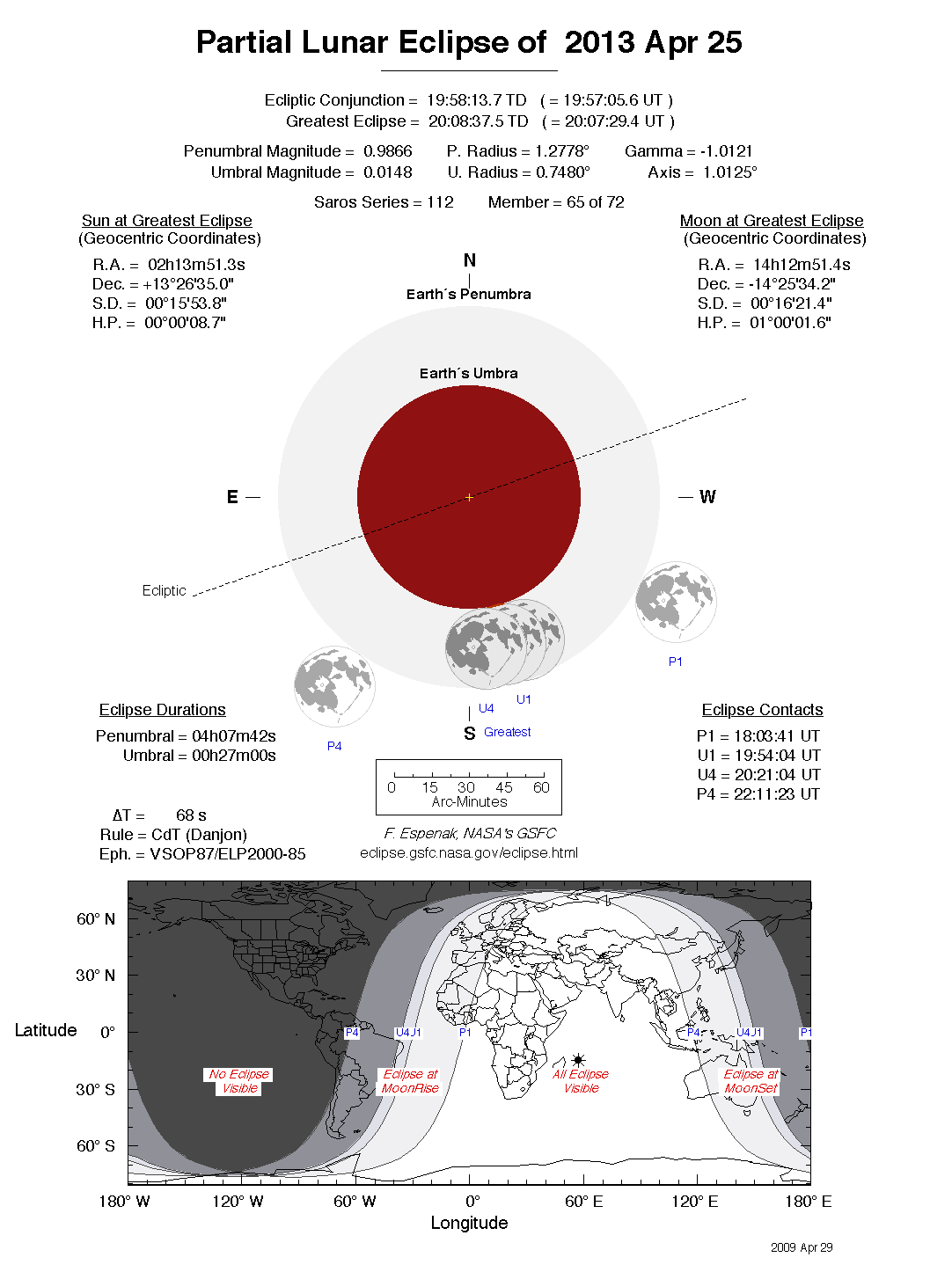 The tables below contain detailed predictions and additional information on the Partial Lunar Eclipse of 2013 Apr 25 .