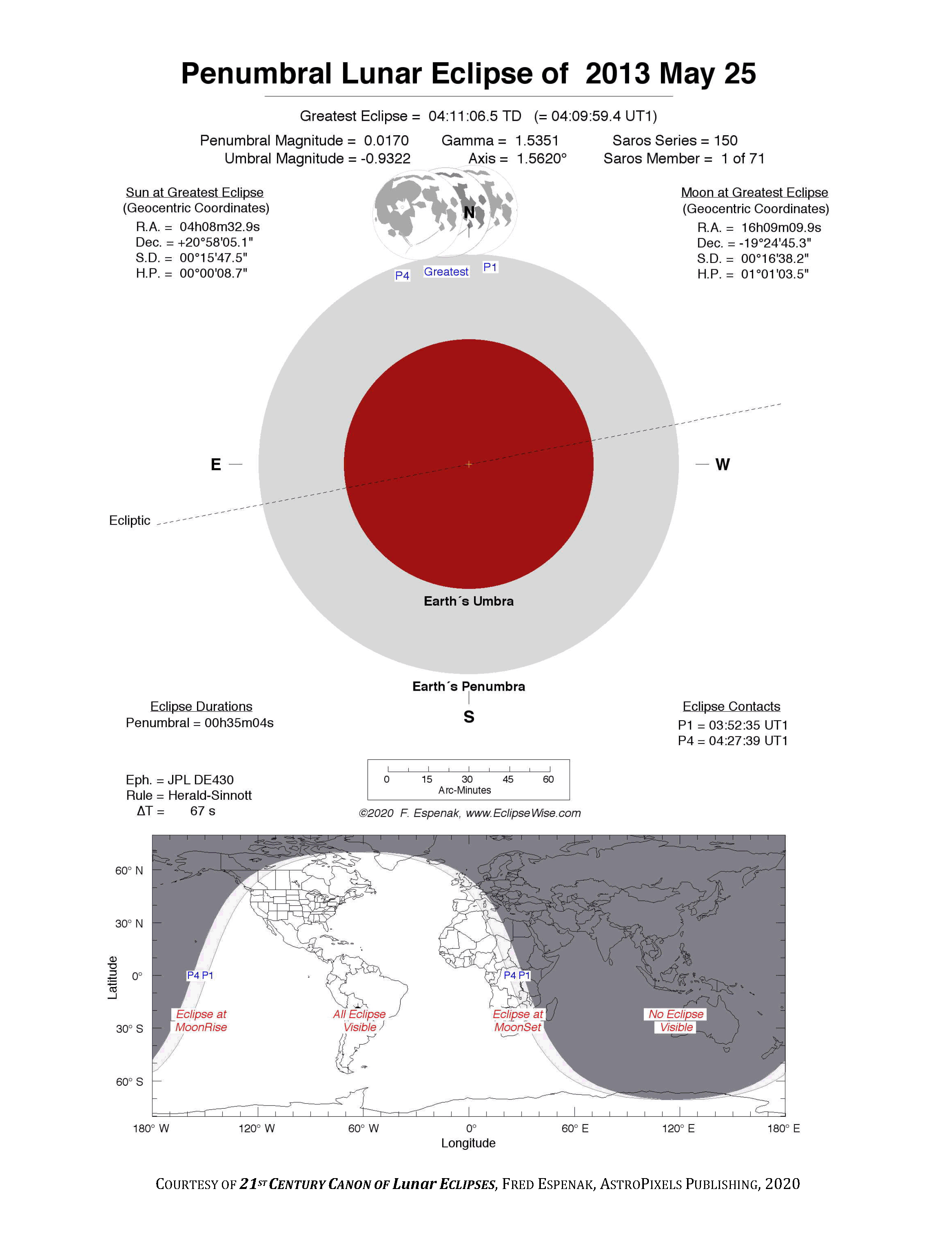 The eclipse belongs to Saros 150 and is number 1 of 71 eclipses in the series. Thus, the 2013 May 25 event is the very first eclipse of the series . All eclipses in this series occur at the Moons ascending node. The Moon moves southward with respect to the node with each succeeding eclipse in the series and gamma decreases.
