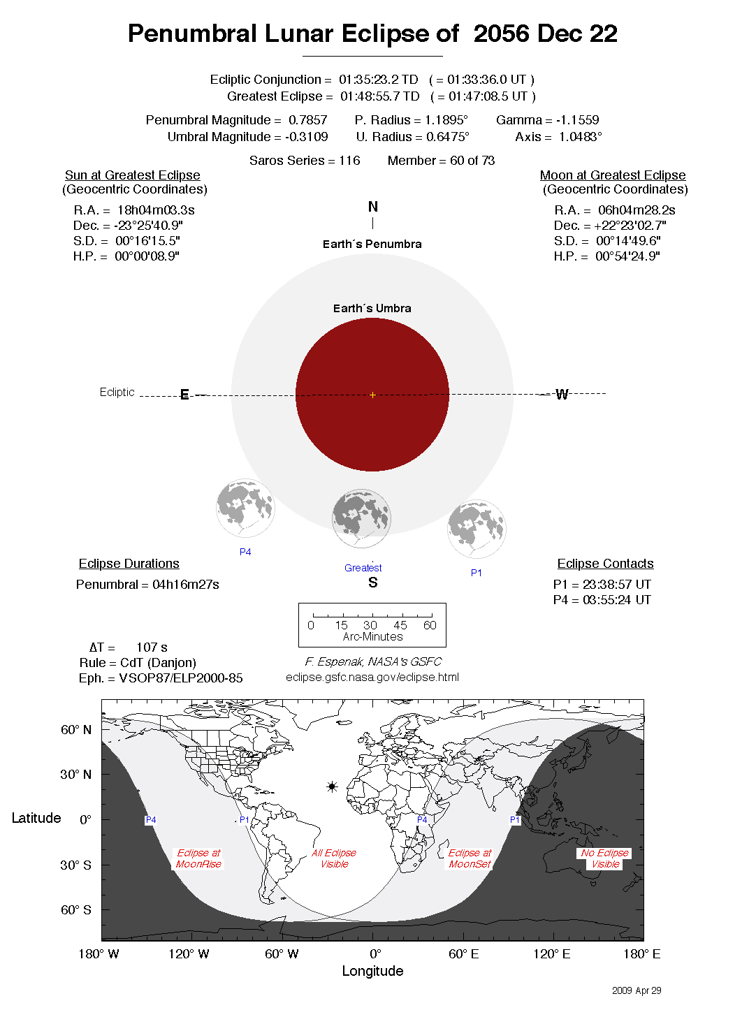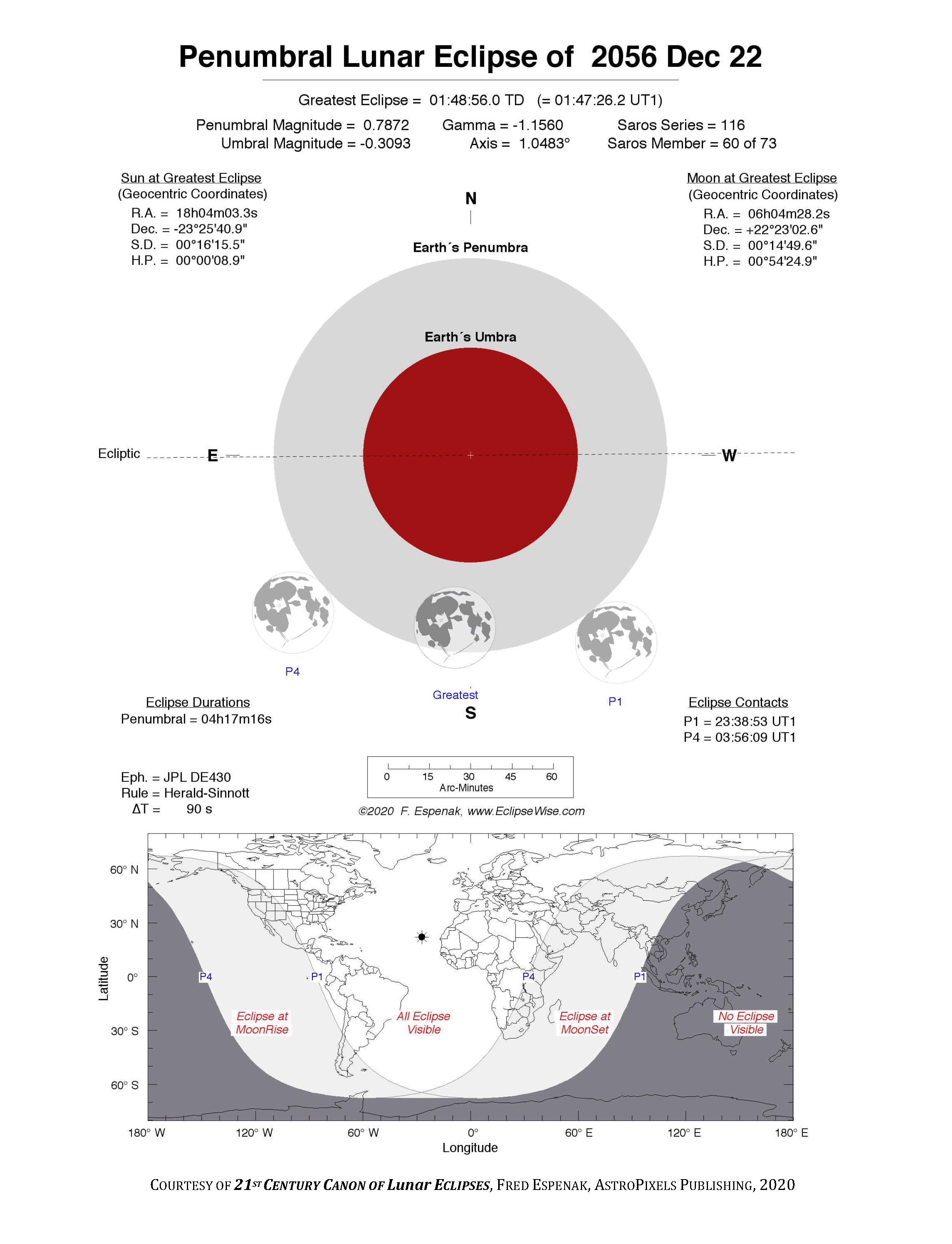 The tables below contain detailed predictions and additional information on the Penumbral Lunar Eclipse of 2056 Dec 22 .