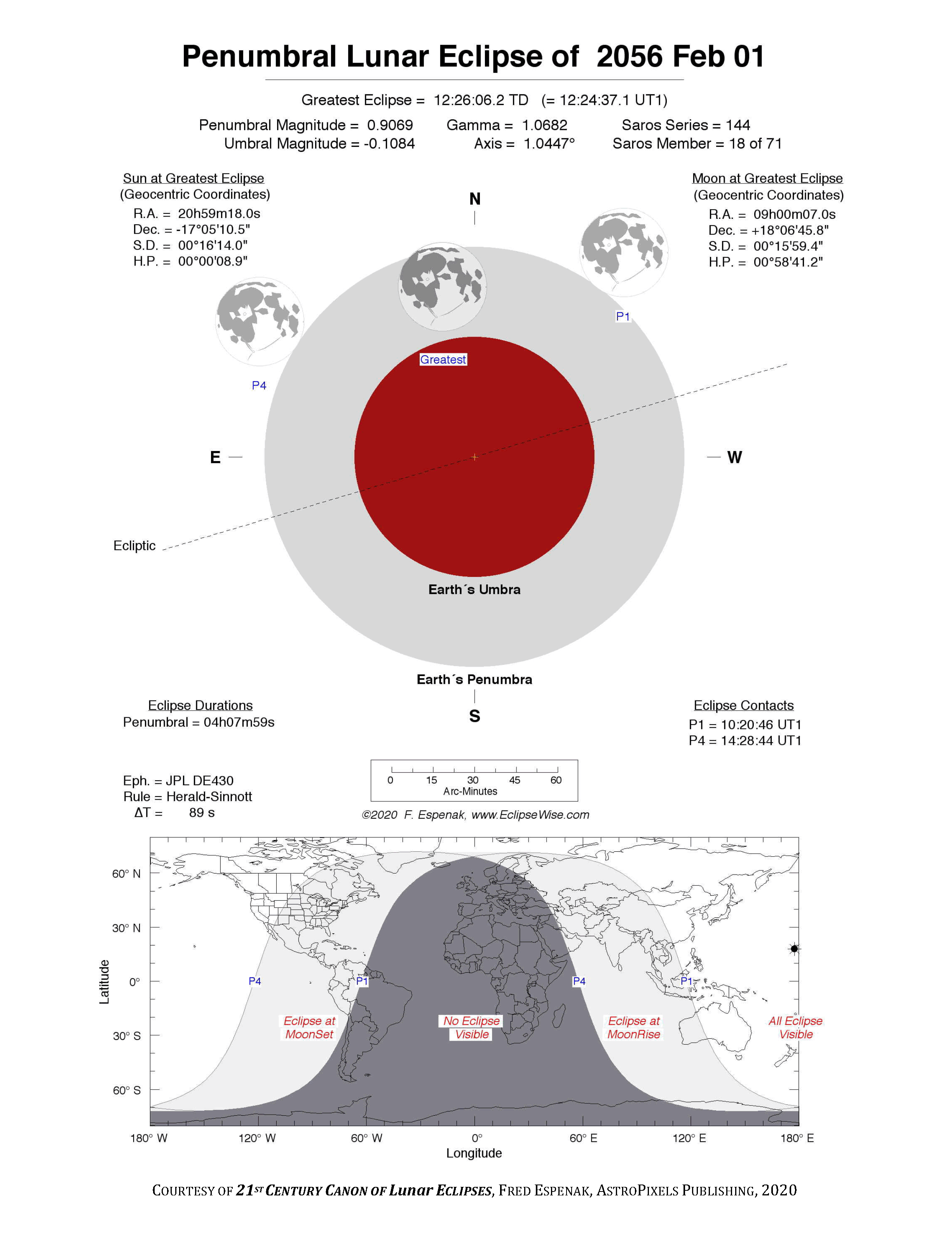 The tables below contain detailed predictions and additional information on the Penumbral Lunar Eclipse of 2056 Feb 01 .