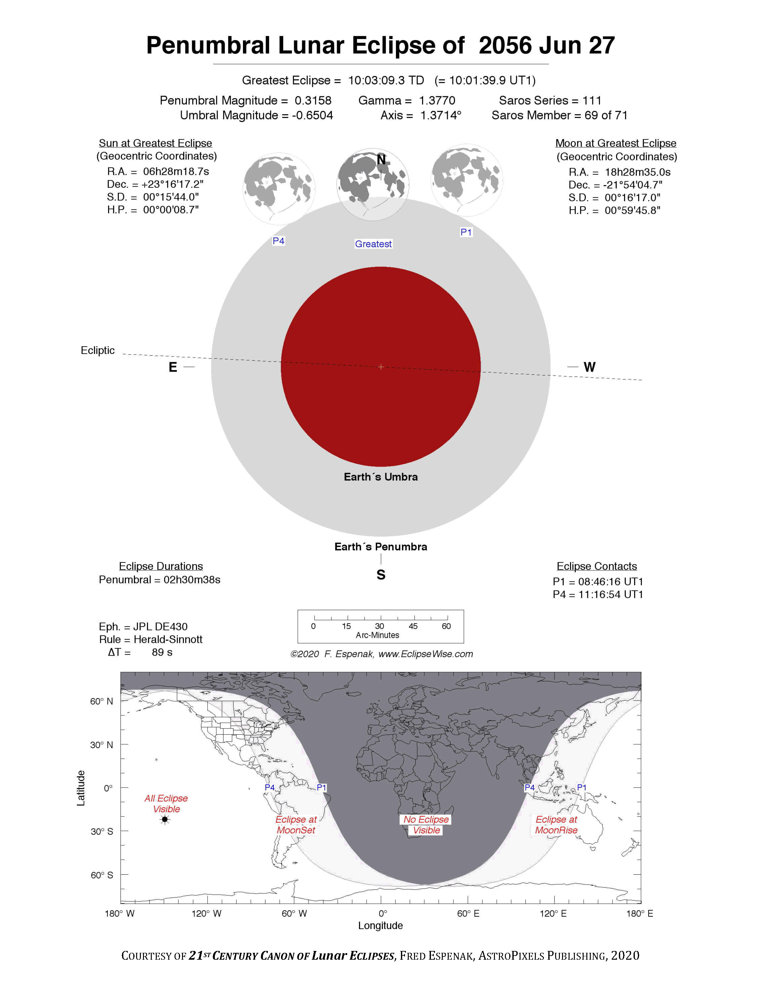 The tables below contain detailed predictions and additional information on the Penumbral Lunar Eclipse of 2056 Jun 27 .