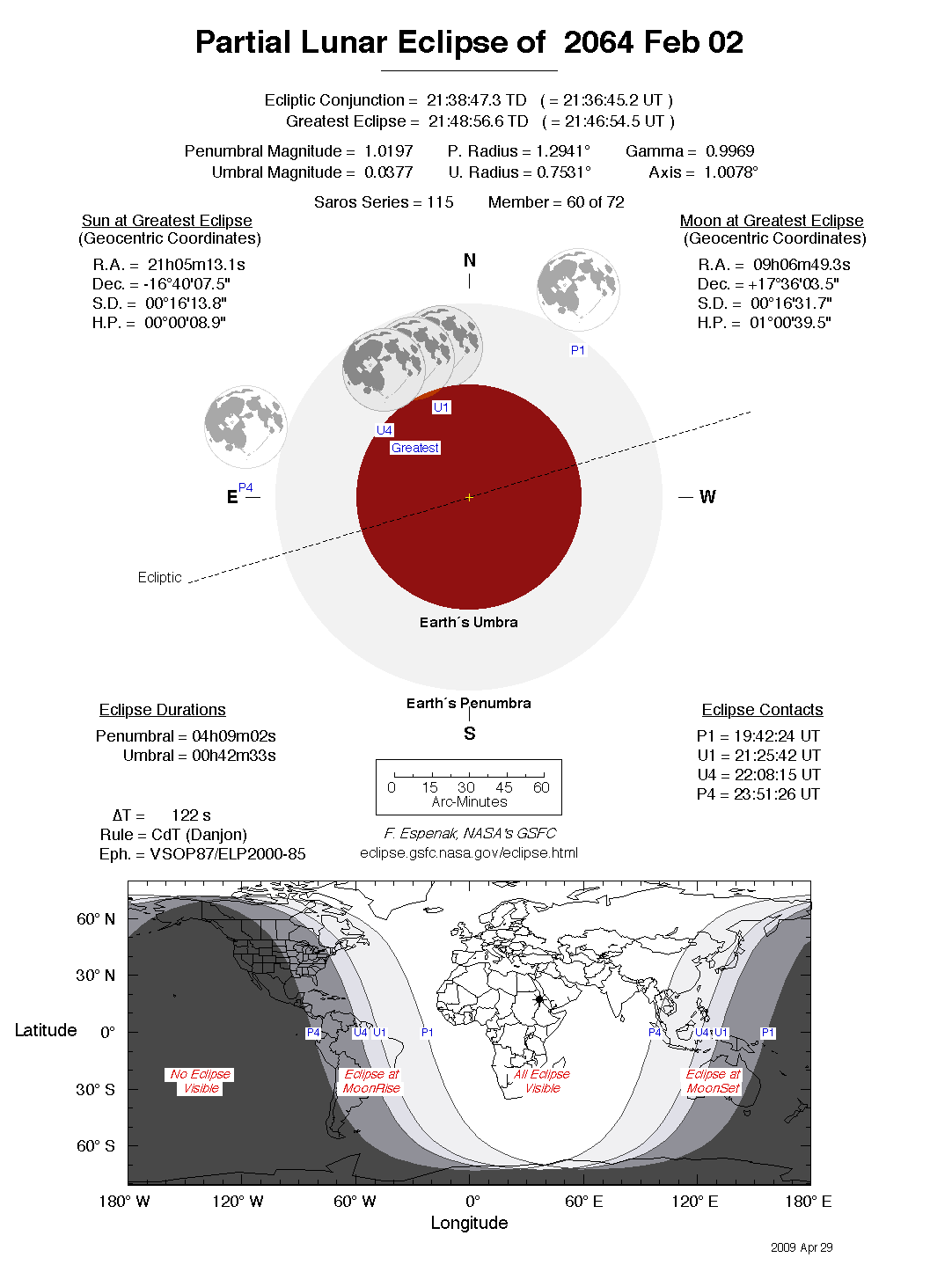The tables below contain detailed predictions and additional information on the Partial Lunar Eclipse of 2064 Feb 02 .