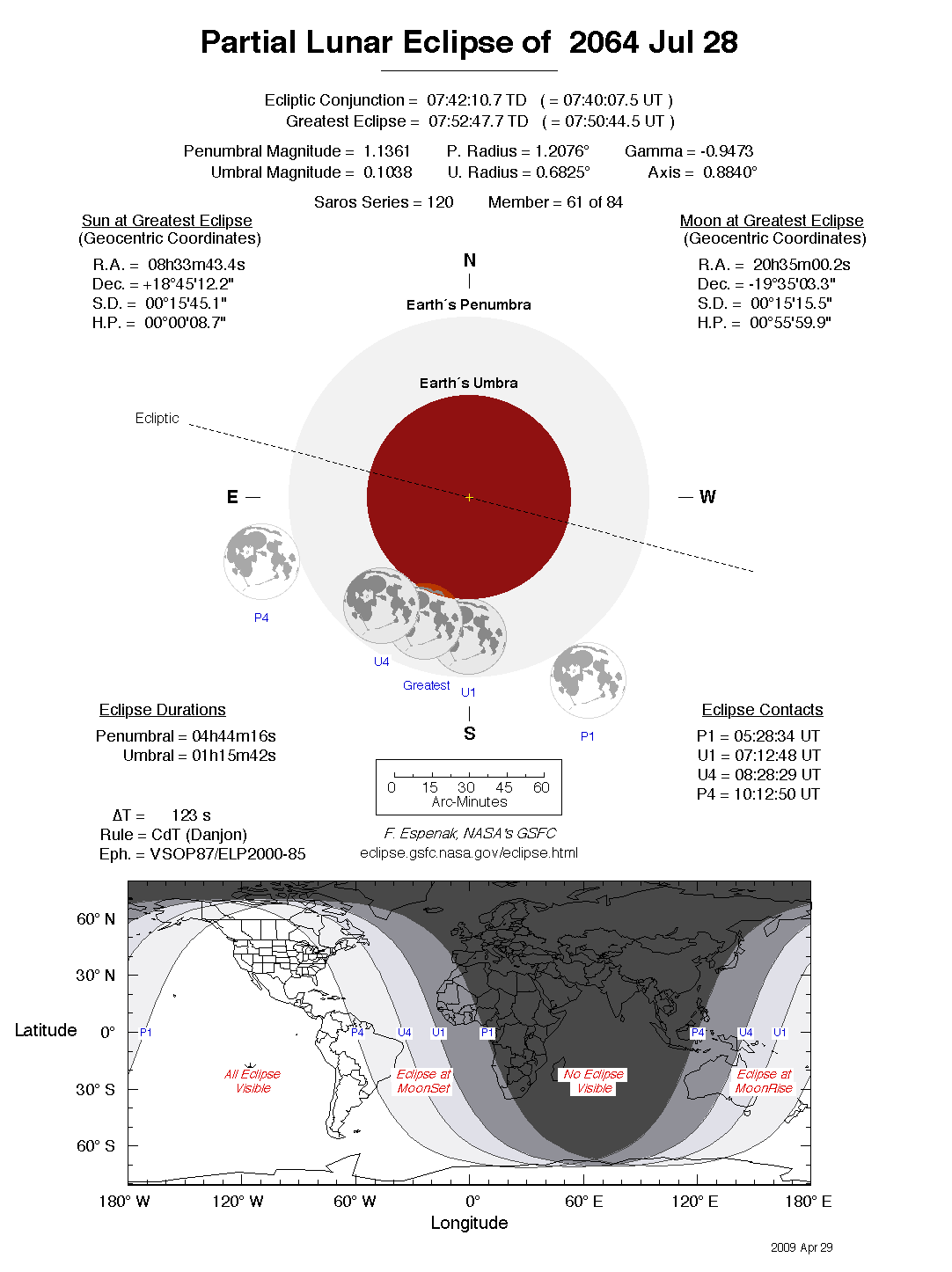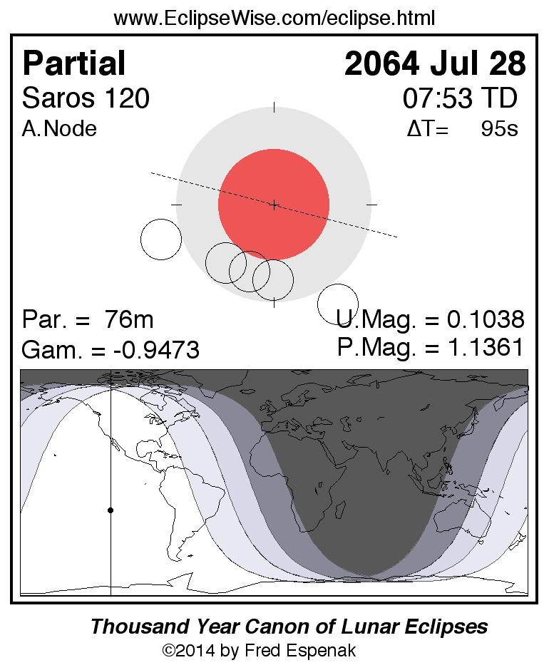 The tables below contain detailed predictions and additional information on the Partial Lunar Eclipse of 2064 Jul 28 .