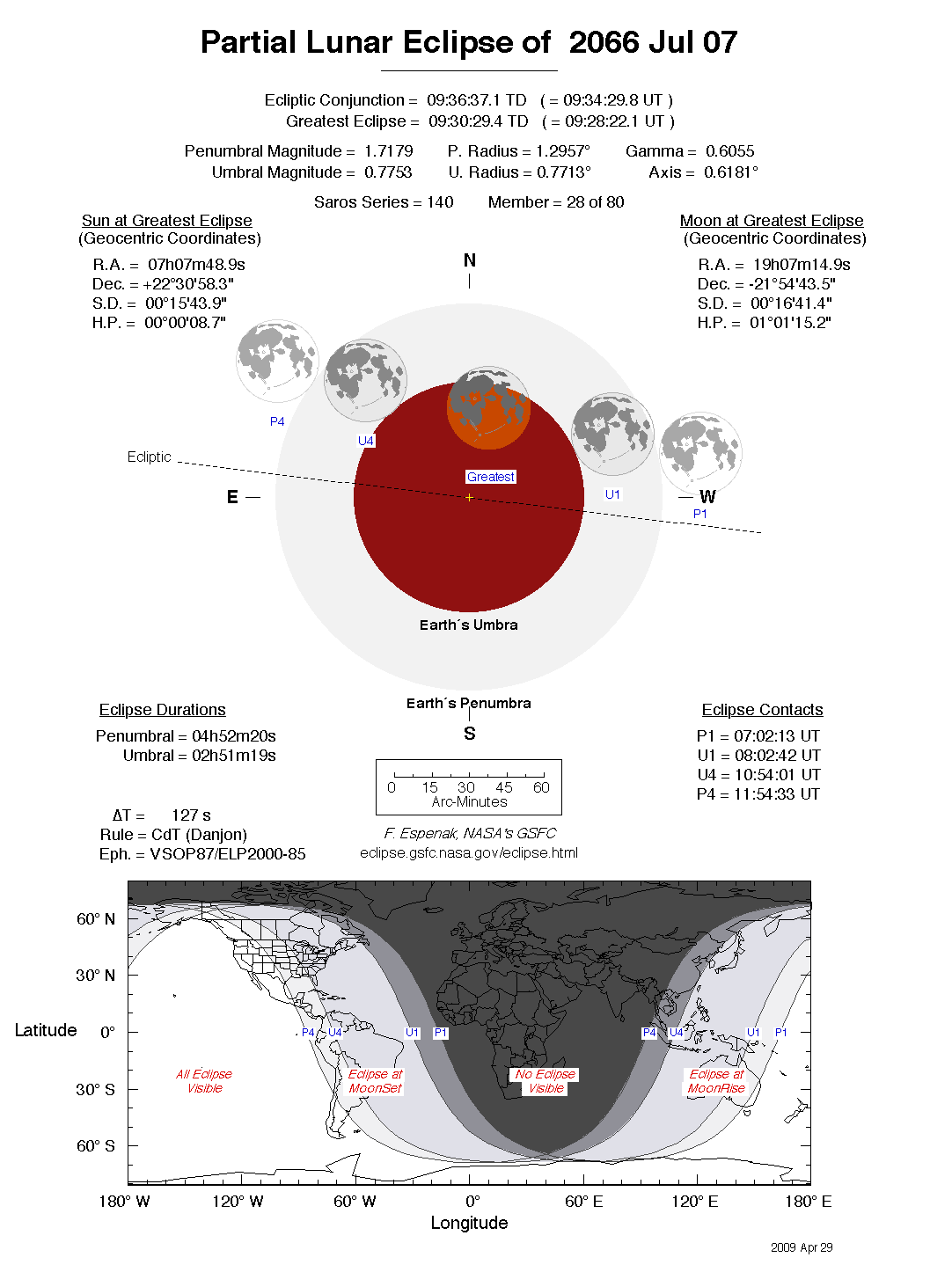 The tables below contain detailed predictions and additional information on the Partial Lunar Eclipse of 2066 Jul 07 .