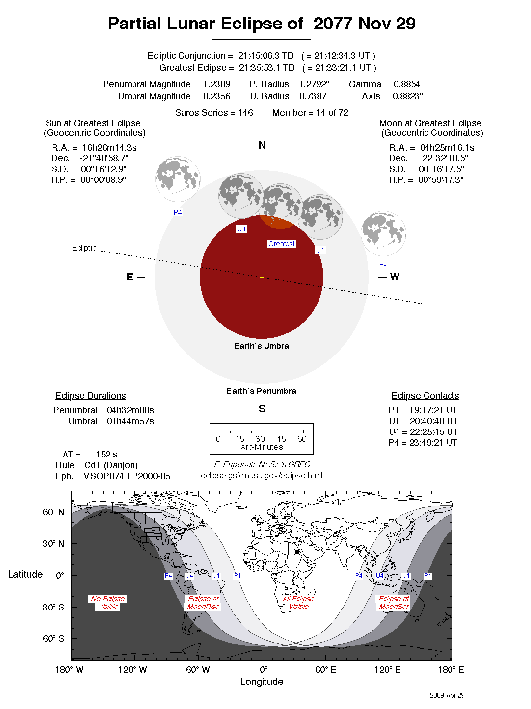 The tables below contain detailed predictions and additional information on the Partial Lunar Eclipse of 2077 Nov 29 .