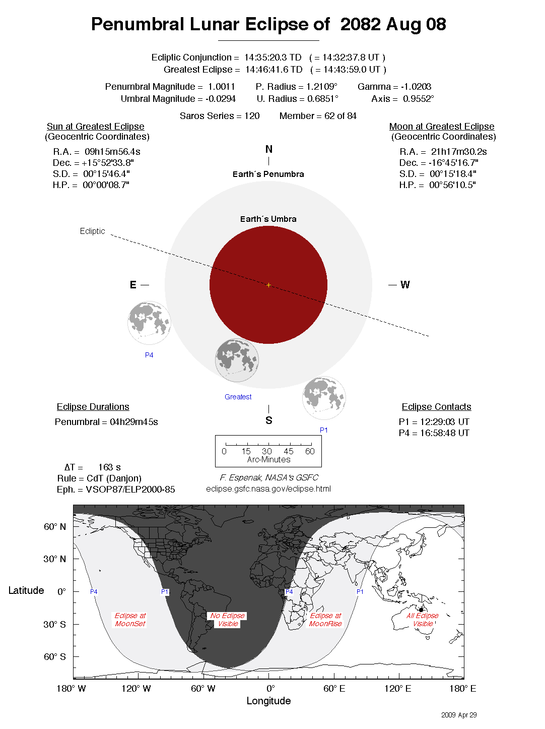The tables below contain detailed predictions and additional information on the Penumbral Lunar Eclipse of 2082 Aug 08 .